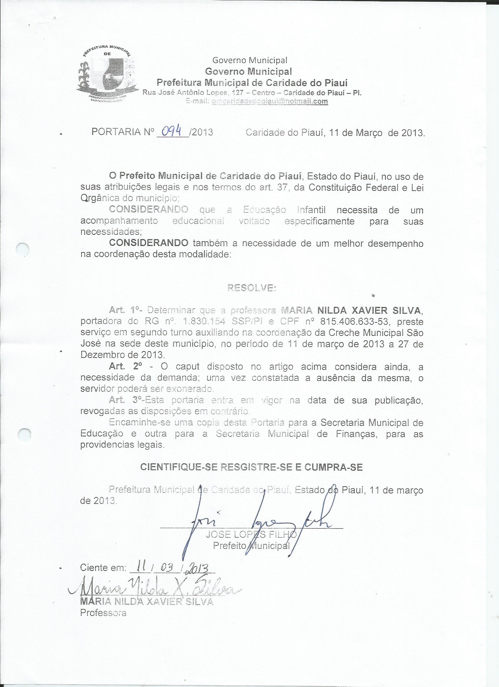 Lei publicada PORTARIA Nº 094/2013PORTARIA |