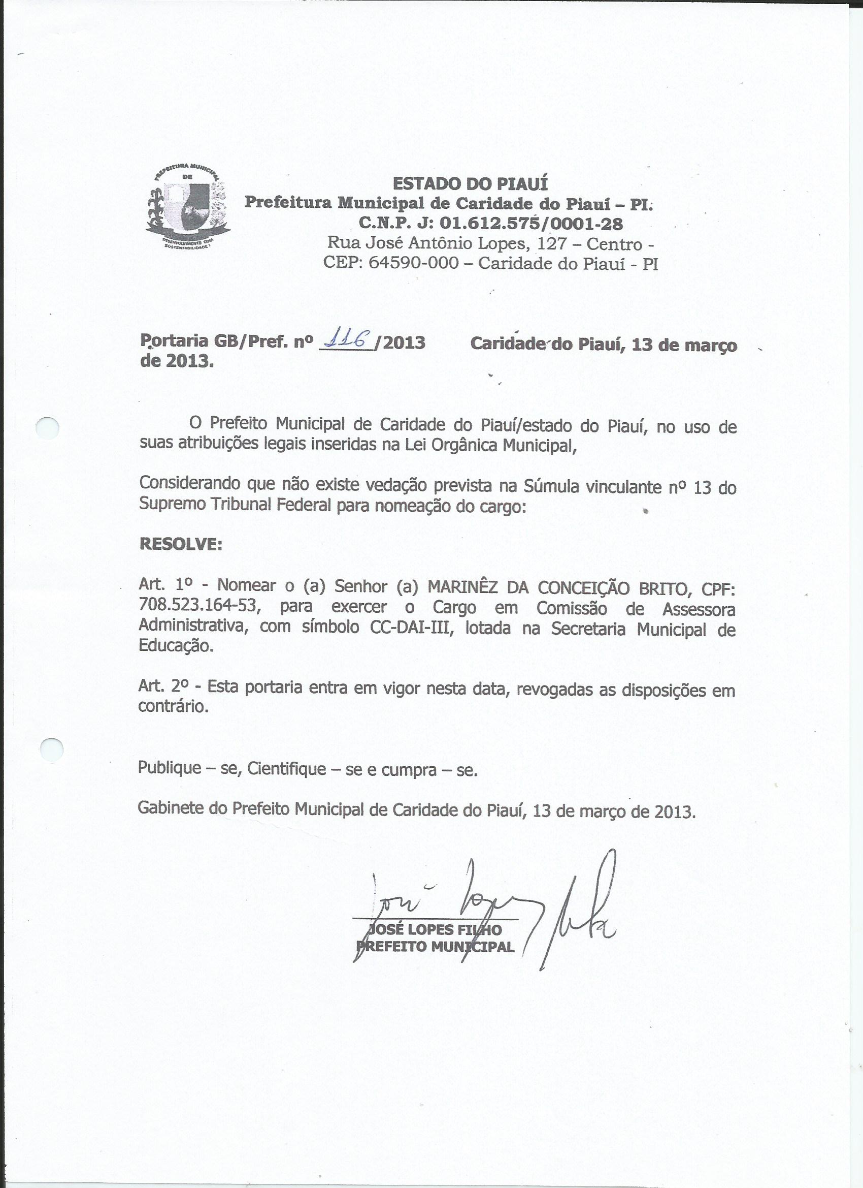 Lei publicada PORTARIA Nº 116/2013PORTARIA |