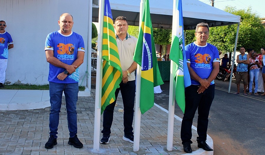 Em seguida, em frente à sede do Poder Executivo Municipal, foi realizado o hasteamento das bandeiras do Brasil, do Estado do Piauí e de Caridade do Piauí, conduzido pelo prefeito Clei Carvalho, pelo vice-prefeito Willamy Silva e pelo presidente da Câmara Municipal, Ivanildo Xavier