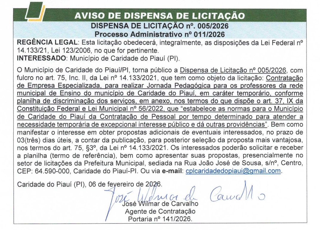 AVISO DE DISPENSA DE LICITAÇÃO N° 005/2026