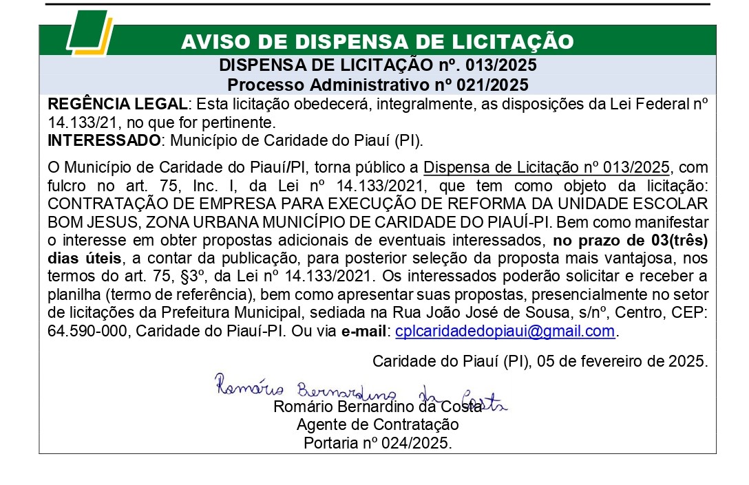 AVISO DE DISPENSA DE LICITAÇÃO N° 013/2025
