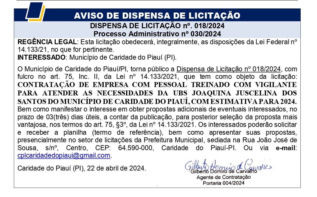 AVISO DE DISPENSA DE LICITAÇÃO n°. 018/2024