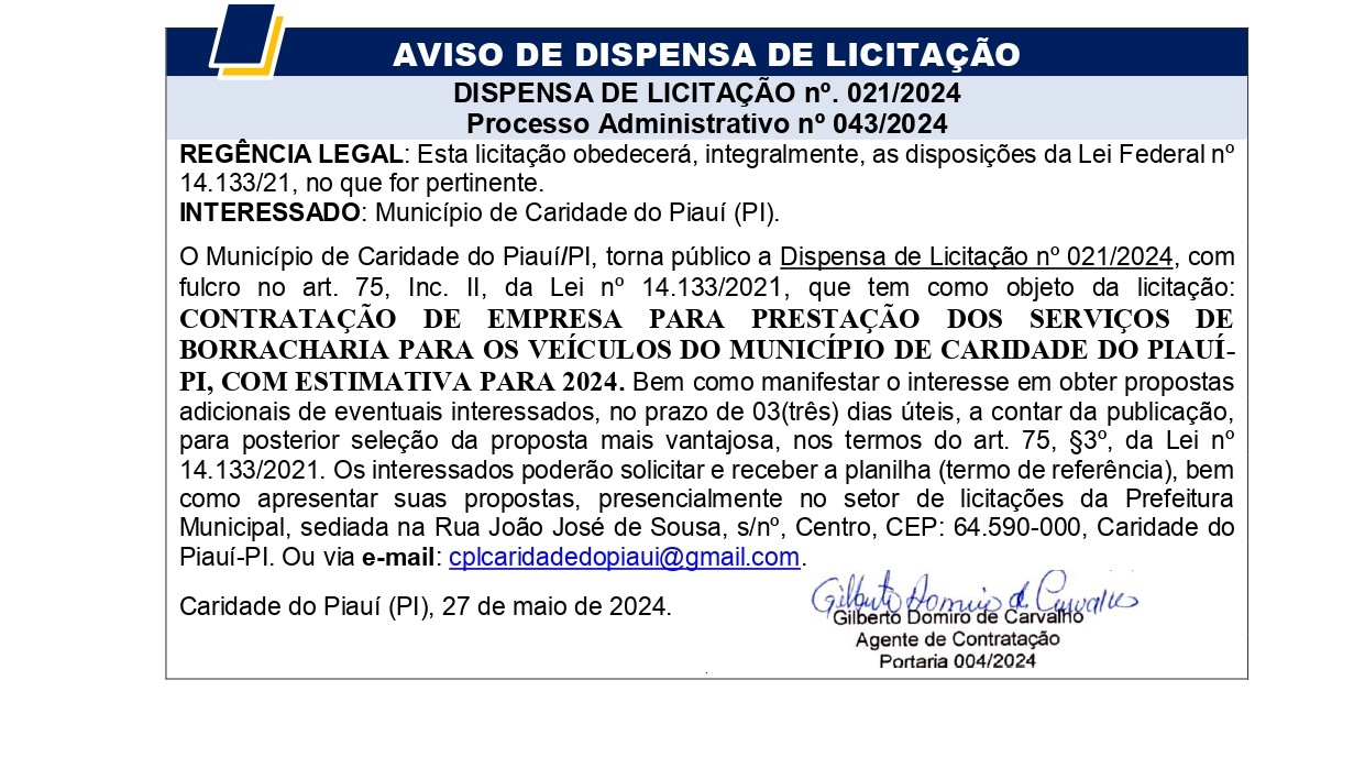 AVISO DE DISPENSA DE LICITAÇÃO N° 021/2024