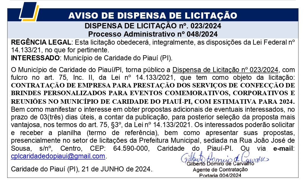 AVISO DE DISPENSA DE LICITAÇÃO N° 023/2024
