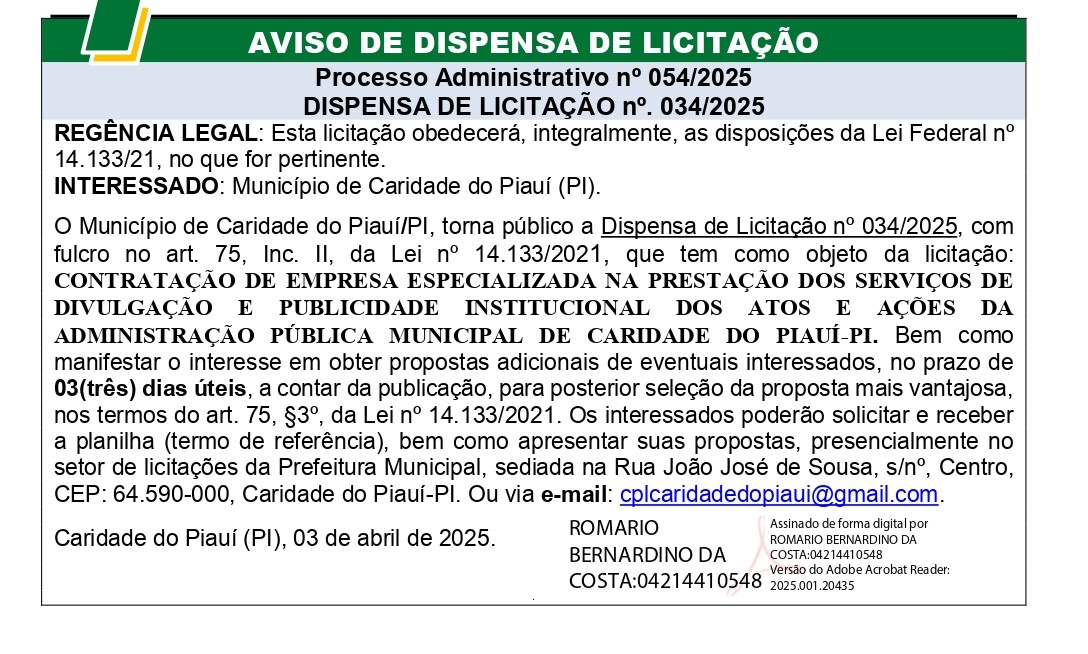 AVISO DE DISPENSA DE LICITAÇÃO N° 034/2025