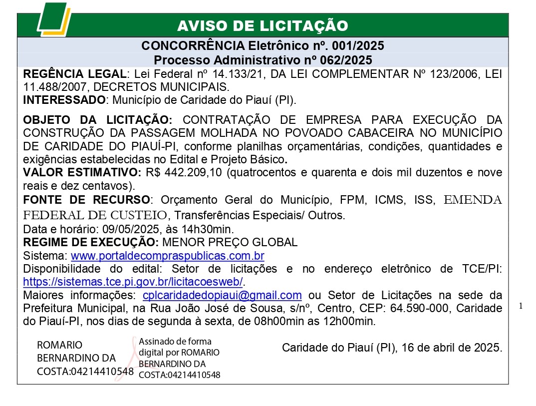 AVISO DE LICITAÇÃO CONCORRÊNCIA ELETRÔNICO N° 001/2025