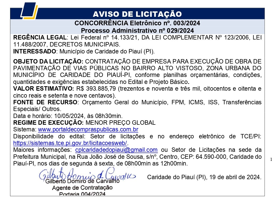 AVISO DE LICITAÇÃO CONCORRÊNCIA ELETRÔNICO N° 003/2024